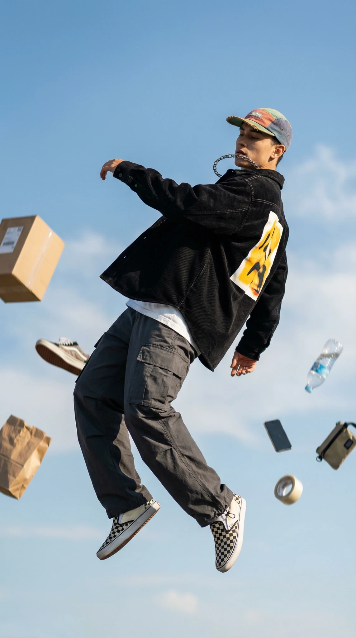 Floating mid-air scene featuring an aesthetic strange person in full contemporary streetwear, surrounded by suspended delivery items and accessories.